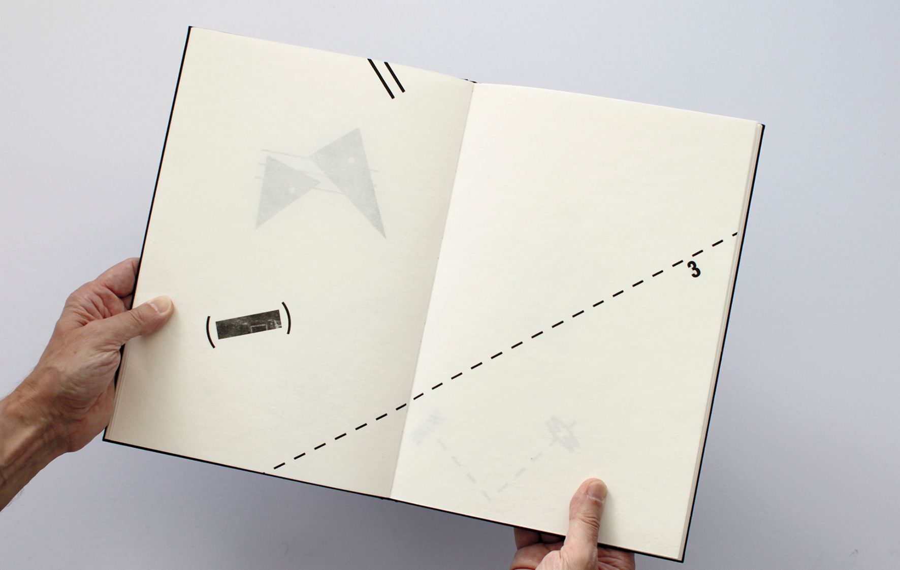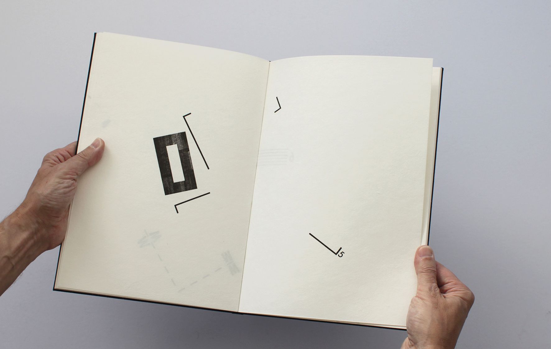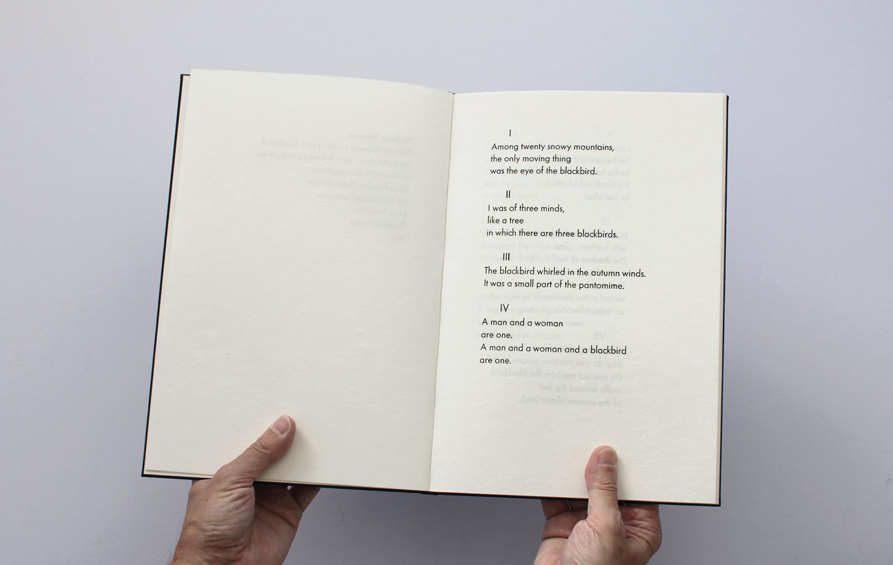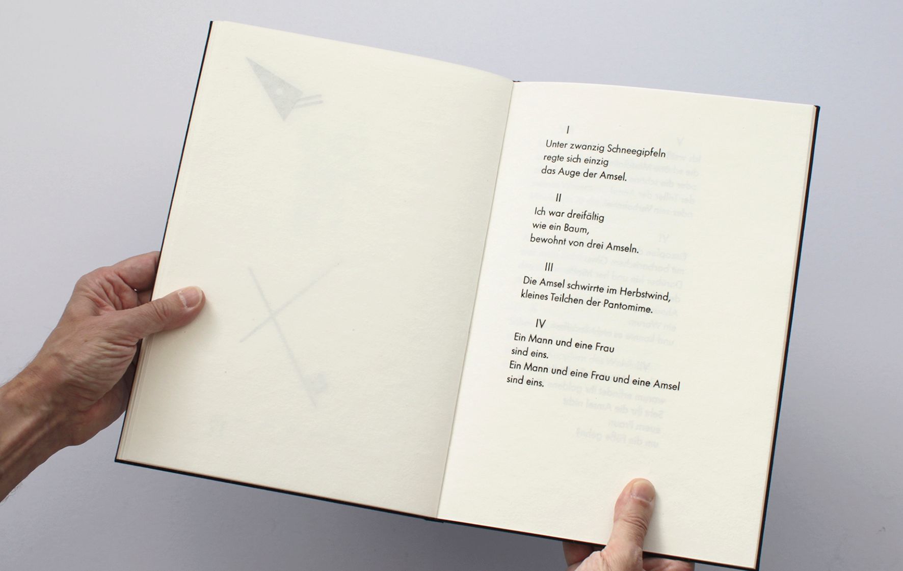 The book begins with the original English of Stevens’ poem cycle. It is followed by a series of 13 letterpress graphics, each on a double page. I used typographic materials: letters and brass rules, along with linoleum blocks and zinc plates. The relative transparency of the Japanese paper allowed me to include shapes from the preceding and following pages in the images. The German translation of the poems follows, printed in the same way as the original version, in 20-point Futura Book.