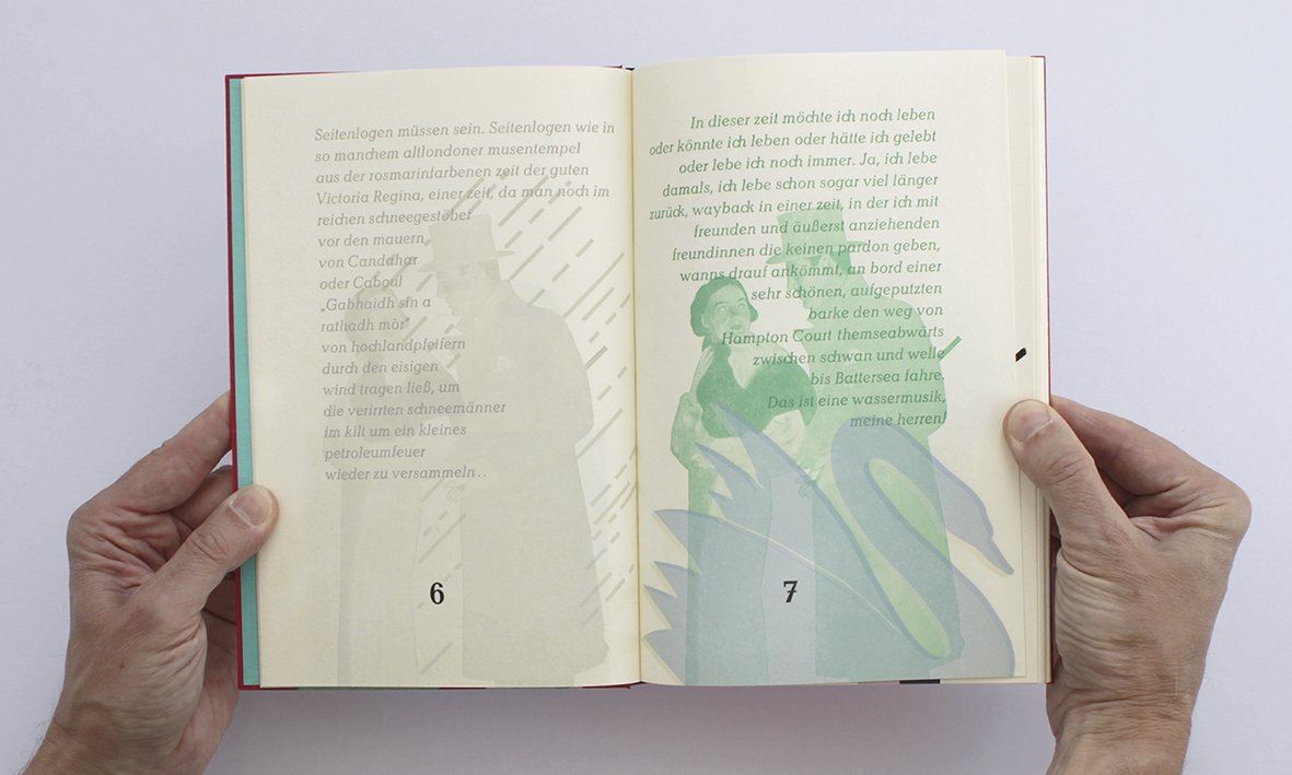 In 1987, a colleague gave me an old zinc plate that showed a couple obviously dressed to go to the opera or the theater: she in a fur coat, he in a top hat. I was once again reminded of Artmann’s Aeronautischer Sindtbart, in whose 30th chapter a theater visit plays an important role. The random appearance of this printing plate gave me the opportunity to illustrate another chapter from Artmann’s text, using the same principle as for the 20th chapter I did in 1983. Once again, one identical printing plate is used on each page, but is constantly varied by applying different colors and overprinting, mainly with linocuts, to concretely illustrate the text. The couple on the plate take on the roles from the Artmann text. I will give an example to explain the roles that color and shape play here. Captain Artmann and his servant Rufus are in a café in a “medium-sized” state capital. Rufus has just called the waiter over, and – to the Captain’s amazement – pays for much more than they have consumed. They converse quietly. The small red line on the left side represents what they are talking about. No one outside the black frame is to hear what they are saying. But maybe someone does hear something, because the inept Rufus whispers so loudly (as suggested by the 28-point type?). "Do you know who that old, discreet waiter was?" asks Rufus. So it’s about the waiter, and the red color has something to do with it. On the right side, the red line takes on a shape. On the next double page, the red shapes come together and become more concentrated (like an animation). "That waiter is the notorious Thelonius C. Vukovic". A page later, the image tilts again, falling apart, and the familiar pair shows up again, still completely under the spell of the red Vukovic. "Thelonius C. Vukovic is the worst arch-magician in Europe. If I had not paid him straight away today, the two of us would never have gotten to the theater door". Vukovic turns up two more times in the book. Now we know right away who he is, even on the last double page when all of the characters from the text return for the finale, while a large, rust-red velvet curtain is creakily drawn across the drama.