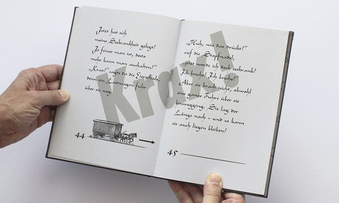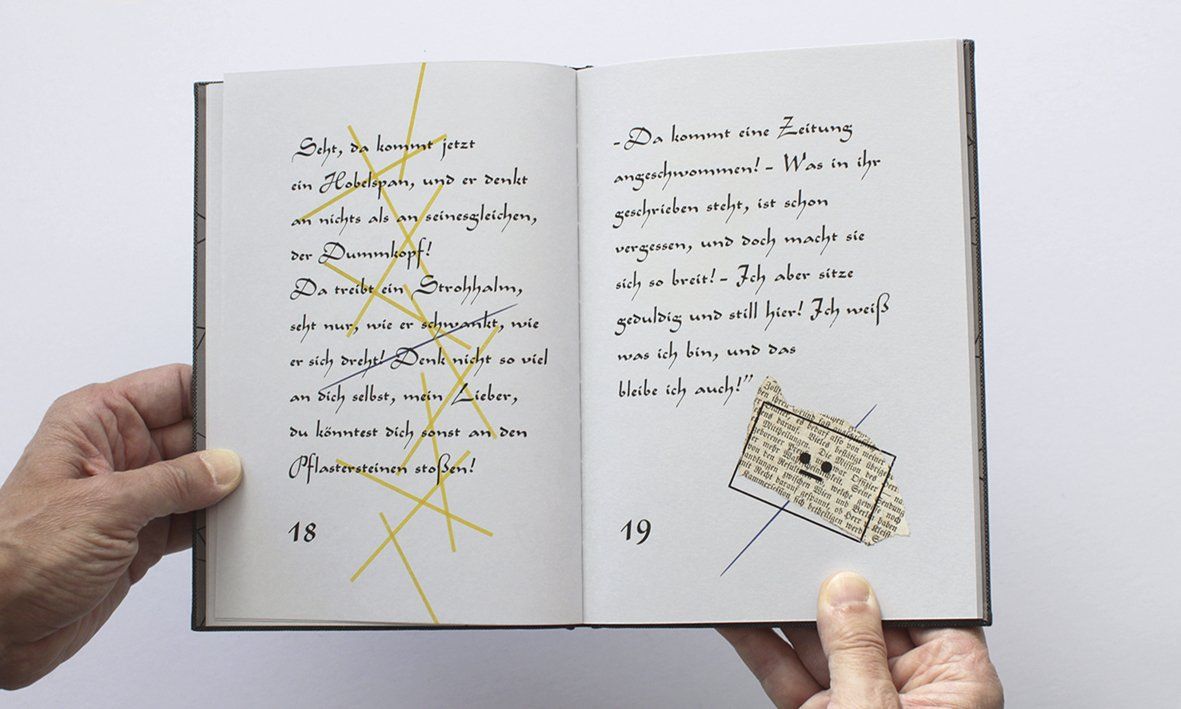 Die Stopfnadel (The Darning Needle) relates the experiences of everyday objects as parables for human behavior. To illustrate this story, I used items from my letterpress workshop: typesetting materials, zinc plates, brass rules, wire, linocuts. In addition, I used various collage materials – found material, for instance from fashion catalogues, but also a scrap of an original Frankfurter Postzeitung, a newspaper published in 1852, (during Andersen’s lifetime). For the darning needle itself, which appears on every page, I used an English line (a brass rule that narrows to a point at each end). It first appears on the front end paper, surrounded by blue Parentheses to set it apart from a mass of similar darning needles. On the front cover, it appears as the original needle. When the darning needle breaks while patching an old slipper, her career as a darning needle comes to an end. The kitchen maid tucks the needle into her apron. Now the needle believes herself to be something quite special, a breast-pin. But she falls down the drain and is washed into the gutter with the dishwater. On page 14, you see the needle’s involuntary tailspin. Her fall ends in the gutter, where the darning needle meets all kinds of “personalities”, for instance a shard from a bottle, which she thinks is a diamond. The darning needle tells the shard about her life, describing the five fingers that were only employed to hold her. She introduces the individual fingers: the thumb, who stands first in the rank and has only one joint in his back. Sweet-tooth, who dips himself into foods both sweet and sour and points to the sun and the moon (or the page number). Longman, who looks out over the heads of the others. Gold-band, with a golden ring around his waist. And the smallest of all, little Playman, who does nothing at all and is proud of it. The darning needle also talks about her plunge into the sink (we are reminded of the involuntary, whirling fall on page 14). In her tale, she idealizes the fall; in the illustration, it becomes a perfect dive into the inverted A of the drain (Ausguß in German).